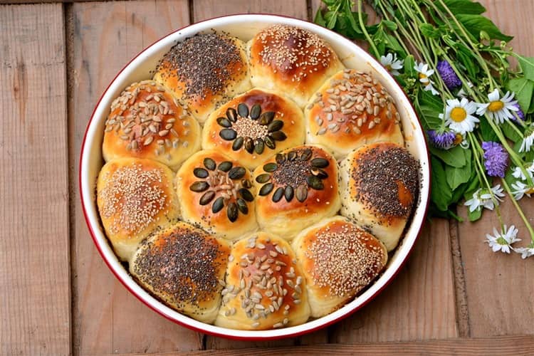 Dignuto tijesto premijesite i razdijelite na 9 dijelova te oblikujte okrugle kruščiće. Posložite ih na okrugli nauljen lim, premažite razmućenim jajetom i pospite sjemenkama.
