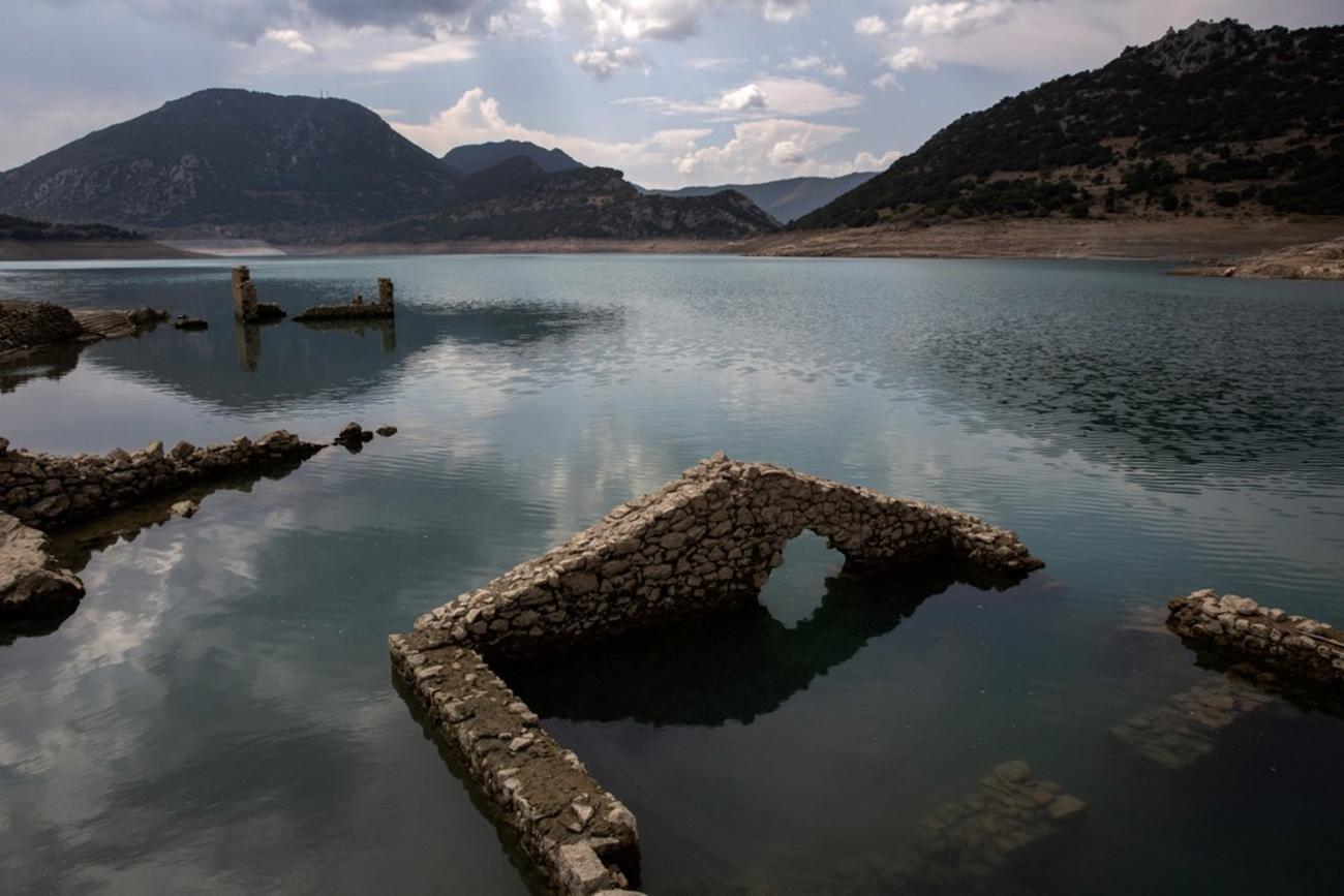 Na fotografijama se vide kameni ostaci potopljenih kuća koji su se pojavili kada je nivo veštačkog jezera Mornos pao posle suše, u blizini sela Lidoriki, oko 240 kilometara severozapadno od Atine. Nakon izgradnje veštačkog jezera potopljeno je oko 80 kuća i drugih objekata, uključujući crkvu i osnovnu školu.
